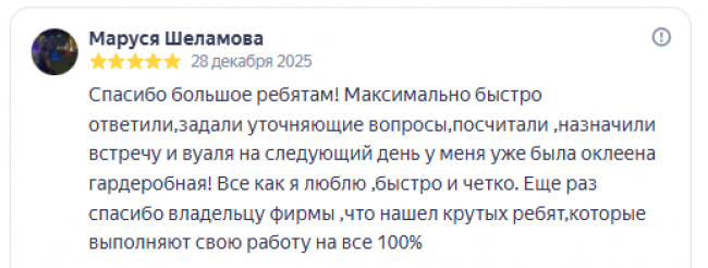 Чтобы заказать оклейку, оставьте заявку на сайте или позвоните нам в офис. Наши специалисты приедут к вам, сделают замеры и покажут образцы пленки. В оговоренное время, будет произведен монтаж.